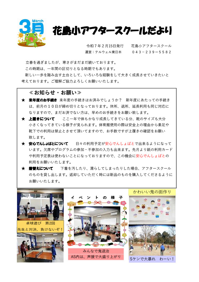 | 利用時間 | 通常授業日(月~金) 授業終了後~午後7時 土曜日、振替、長期休業日 午前8時~午後7時 |